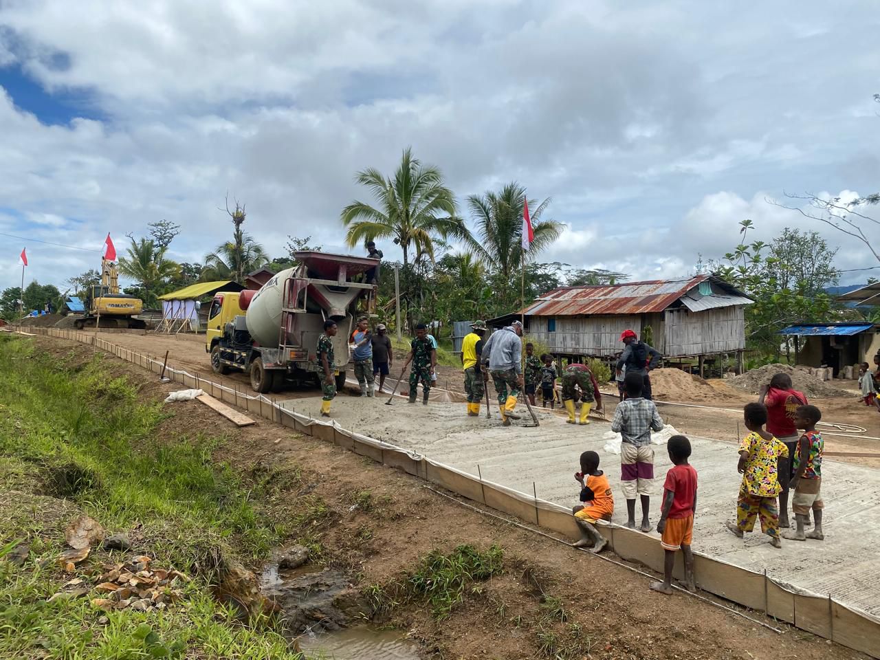 Sejak pagi, tampak prajurit TNI dan masyarakat bekerja bergotong royong mengangkut material, meratakan adukan semen, dan memperkuat sisi jalan. Semangat kebersamaan terlihat jelas, di mana setiap warga turut mengambil peran dalam mendukung penyelesaian pembangunan infrastruktur tersebut. Cuaca yang cerah menambah semangat para pekerja dalam menyelesaikan tahapan pengecoran.