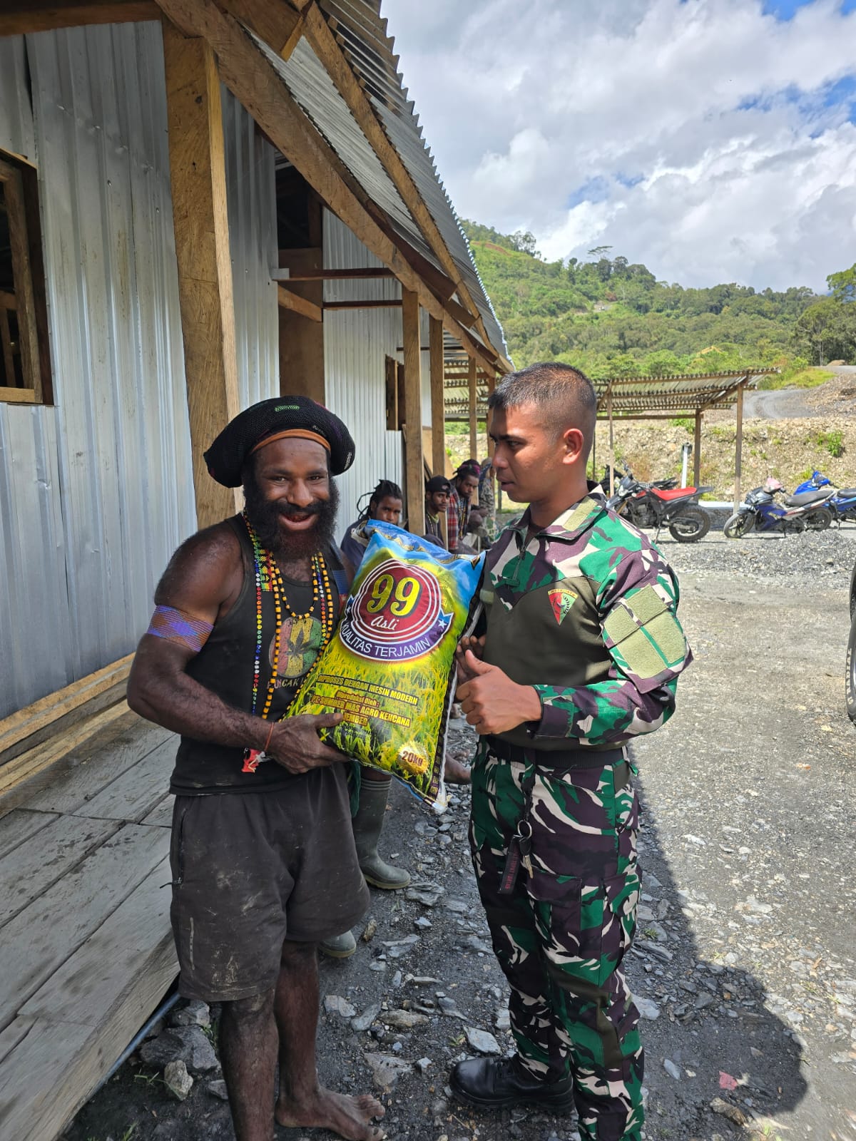 Salah satu warga Bapak Lendison Enumbi (34) mengucapkan syukur atas bantuan berasnya lepas keluarganya “wa…wa…. Terimakasih Bapak sudah kasih bahan makan pa tong dsni, ini sangat berarti bagi sa dan kluarga,, berkat berlimpah kepada bapak smua”. (Pen Satgas Yonif 715/Mtl)