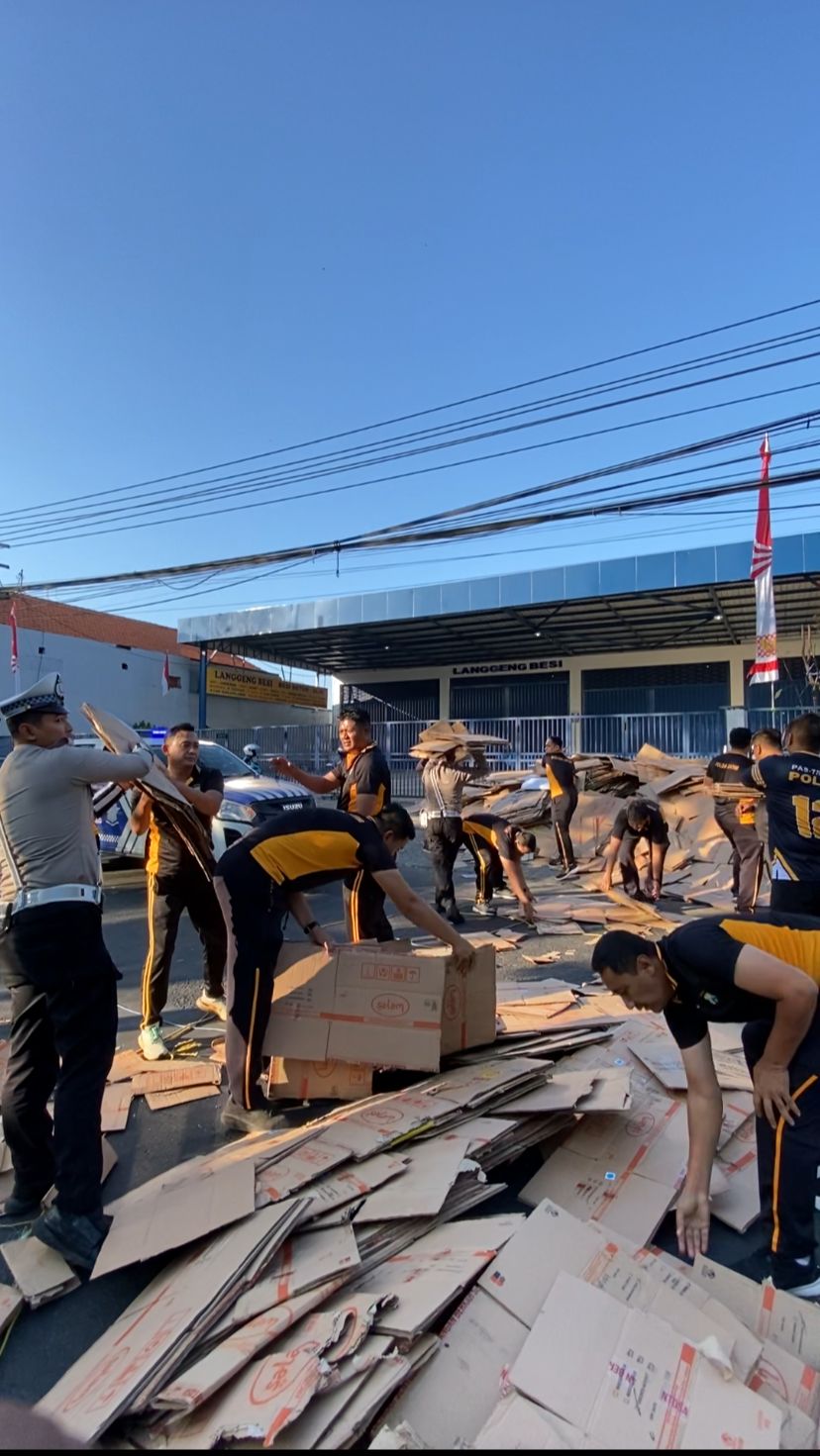 Pasuruan – Satlantas Polres Pasuruan bergerak cepat mengevakuasi kendaraan pick-up bermuatan kardus yang mengalami kecelakaan di Simpang Empat Gudang Garam, Bangil, Jumat pagi, (1/8/25).