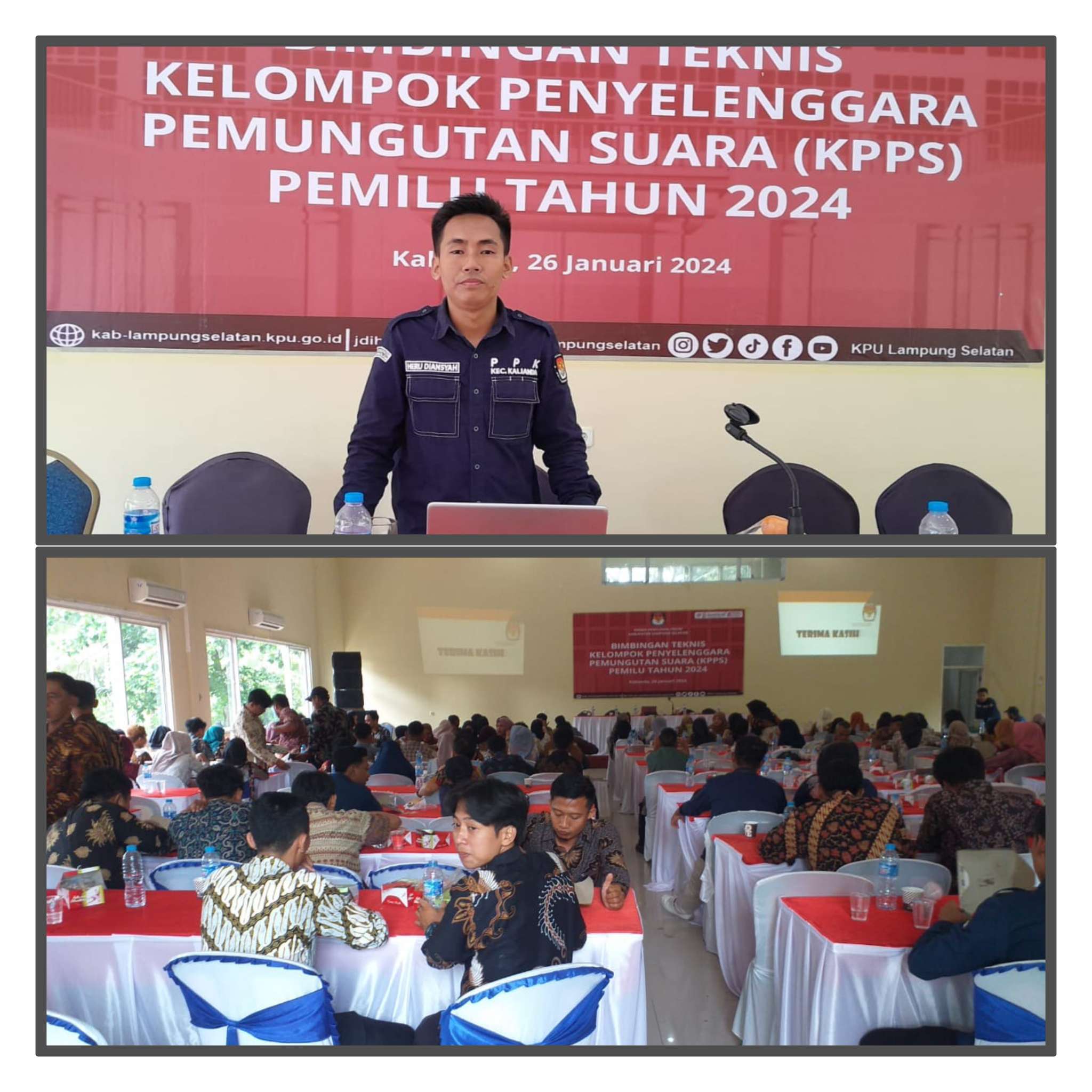 KPPS Desa Canggu, Desa Bulok, Kelurahan Bumi Agung, Desa Merak Belantung. Lalu, untuk di Aula NBR 1 peserta dari Kelurahan Kalianda dan Desa Hara Banjarmanis. Sedangkan untuk di Aula Gedung Dakwah pesertanya dari Desa Kecapi, Desa Pematang, Desa Kedaton, dan Desa Kesugihan. “Pada Bimtek ini, KPPS diwajibkan memahami dan mengerti tugas tugasnya, terutama tentang teknik pemungutan suara di TPS dan teknik perhitungan suara,” tambah Heru.
