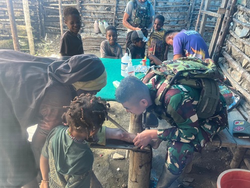 Puncak Jaya – Di Pagi hari yang sejuk dan angin yang berhembus kencang tak disangka masyarakat Tinolok berbodong-bondong dan tentunya dengan adik-adik kecil yang sangat manis berteriak kencang sambil berlari kemudian meminta obat kepada personel Pos Tinolok, dengan sigap personel Kesehatan Pos Tinolok menyambut hangat dan penuh cinta masyarakat yang datang kemudian memeriksa keluhannya, Puncak Jaya, Kamis (05/06/2025).