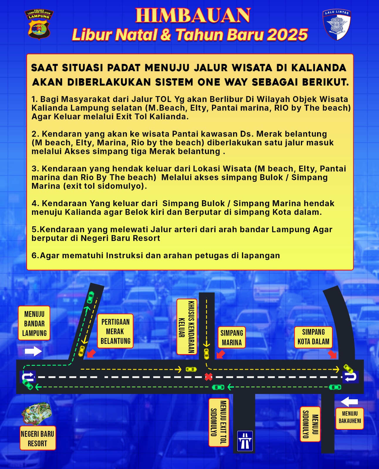 Lampung Selatan, Transpos.id. – Menghadapi lonjakan wisatawan pada libur akhir tahun, Satuan Lalu Lintas Polres Lampung Selatan siap memberlakukan sistem satu arah (one way) di sejumlah ruas jalan strategis di kawasan Kalianda. Kebijakan ini bertujuan untuk mengurai kemacetan, khususnya di kawasan wisata pantai populer seperti Pantai Elty, Pantai Marina, dan Rio by the Beach.