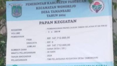 Pasuruan, transpos.id – Desa Tamansari, Kecamatan Wonorejo, Kab.Pasuruan melaksanakan pembangunan pavingisasi manfaatkan Dana Desa/(DD) Rabu 25/9/2024. Kepala Desa Desa Tamansari, Musta’in Romli menyatakan,” bahwa pembangunan jalan paving ini merupakan salah…