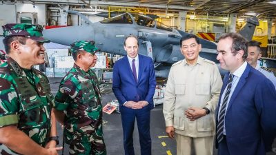 NTB – Panglima TNI Jenderal TNI Agus Subiyanto bersama Kepala Staf Angkatan Laut (Kasal) Laksamana TNI Muhammad Ali mendampingi Menteri Pertahanan RI Sjafrie Sjamsoeddin dalam peninjauan Kapal Induk Prancis Charles…