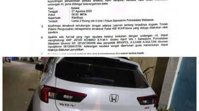 Makassar, transpos.id – Oknum penyidik di Polrestabes Makassar terkesan memaksakan kasus kecelakaan lalu lintas (Laka Lantas) ringan ke dugaan pengrusakan, sebagaimana surat klarifikasi ke terlapor yang diterbitkan pertanggal 20 Agustus…