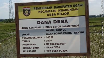 Ngawi – Proyek pembangunan jalan yang bersumber dari Dana Desa (DD) di Desa Pojok, Kecamatan Kwadungan Kabupaten Ngawi, menjadi sorotan masyarakat. Pasalnya, pengerjaan proyek tersebut diduga tidak sesuai dengan Rencana…