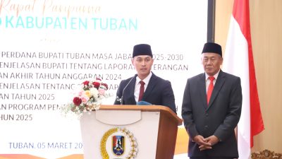 Tuban – Bupati Tuban, Aditya Halindra Faridzky, SE., didampingi Wakil Bupati Tuban, Drs. Joko Sarwono, memaparkan visi dan misi Kabupaten Tuban untuk periode 2025-2030 dalam Sidang Paripurna Istimewa di Gedung DPRD…