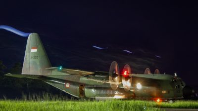 Makassar – Dua pesawat Hercules C-130H dari Skadron Udara 33 Lanud Sultan Hasanuddin membelah gelapnya malam langit Makassar, pada Selasa malam (11/2/2025). Di kokpit, redup cahaya hijau Night Vision Goggles (NVG),…