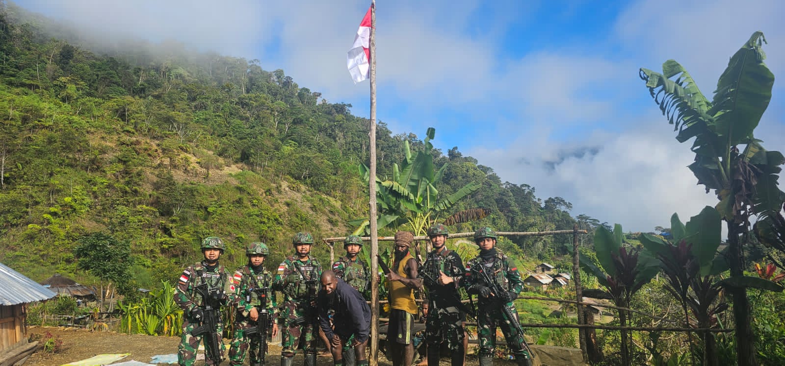 Puncak Jaya – Personel Pos Kulirik Satgas Pamtas Kewilayahan Yonif 715/Motuliato berkeliling ke rumah warga untuk melakukan pemasangan bendera merah putih dan sepanjang jalan menuju pos kanan dan kiri di Kampung Kulirik, Papua, Minggu (02/03/2025).