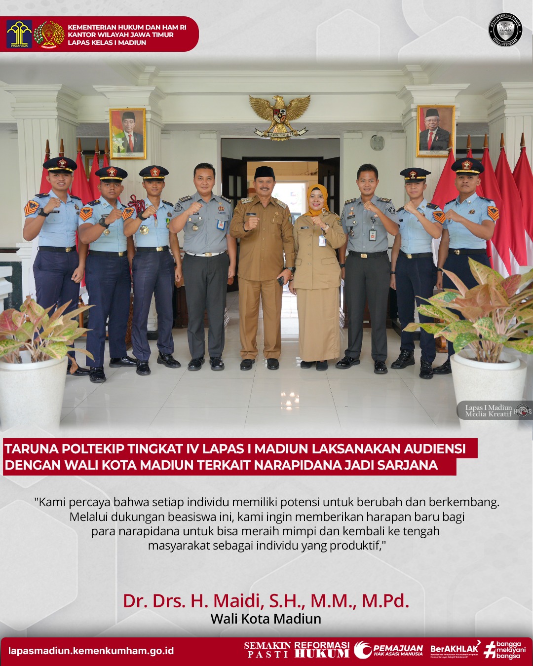 Audiensi yang berlangsung di kantor Wali Kota Madiun ini merupakan bagian dari kegiatan penelitian yang dilakukan oleh taruna-taruna Poltekip. Tujuan utama dari audiensi ini adalah untuk mendapatkan data dan informasi langsung dari sumber yang kredibel mengenai dukungan beasiswa yang diberikan oleh Pemerintah Kota Madiun bagi narapidana yang ingin melanjutkan pendidikan hingga ke jenjang sarjana yang sudah berjalan di Lapas I Madiun.