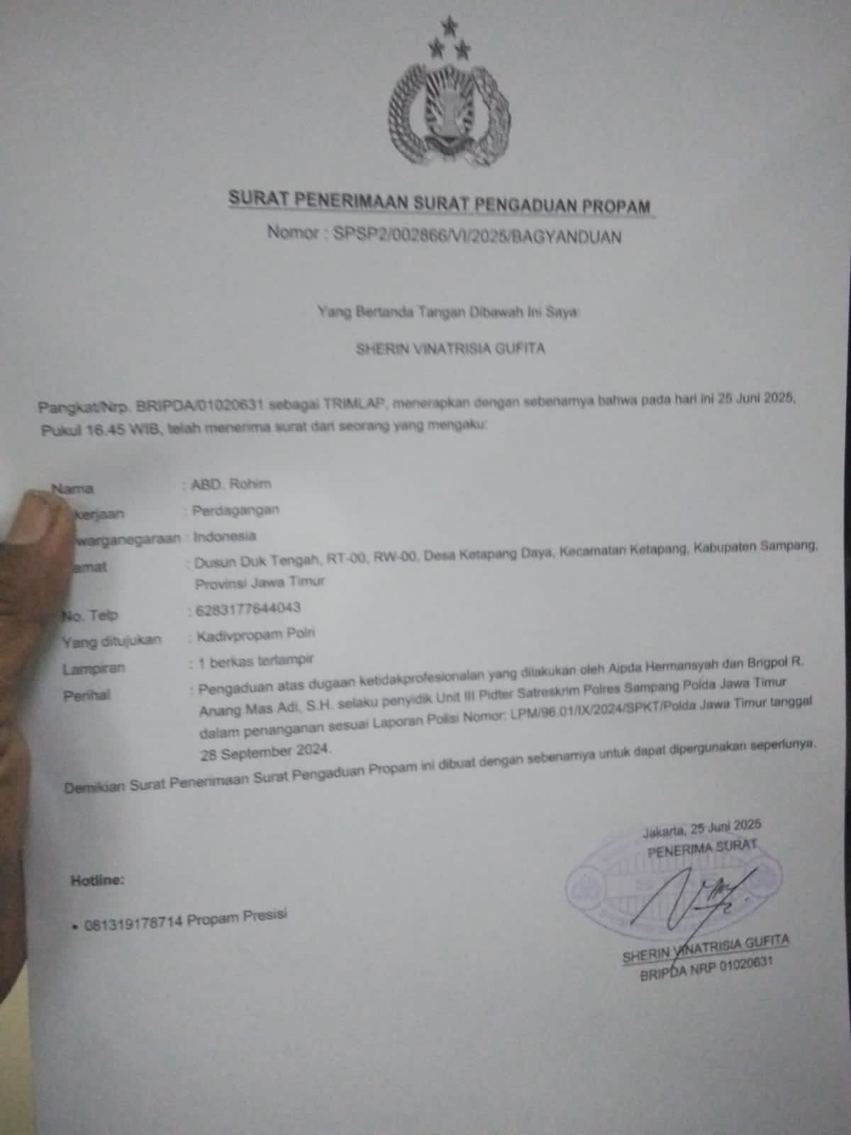 Dengan aduan tersebut, Sunaidi dan Abd. Rohim berharap Propam Mabes Polri turun tangan menindaklanjuti secara profesional, melakukan klarifikasi ke BPN Sampang, serta memastikan adanya kepastian hukum yang adil.