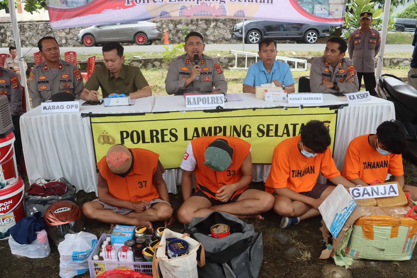 Kapolres Lampung Selatan dalam konferensi pers pada Kamis, 30 Januari 2025, menjelaskan bahwa Tim Sikat Rajabasa berhasil menangkap dua tersangka, yakni SO (48 tahun) dan RAM (28 tahun). Kedua tersangka diamankan di kediaman mereka di wilayah Kalianda dengan sejumlah barang bukti yang cukup banyak.