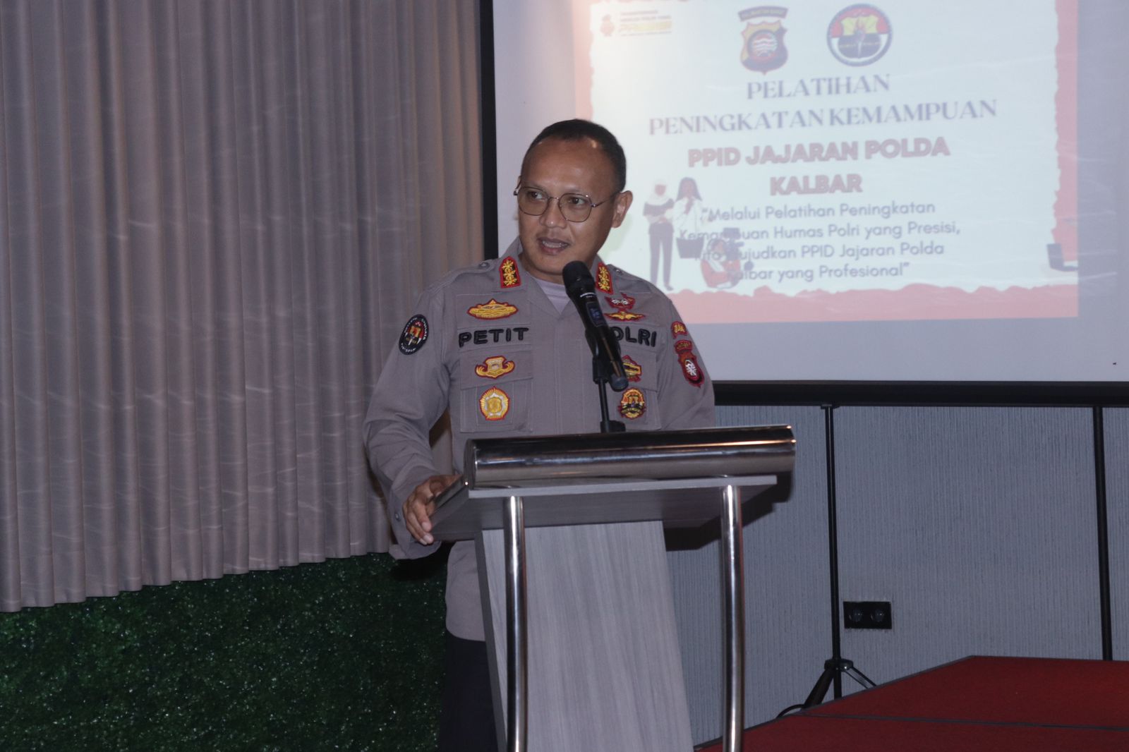 Kegiatan yang diikuti Kasi Humas dan operator Polres Jajaran Polda Kalbar tersebut di buka secara langsung oleh Kabid Humas Polda Kalbar Kombes Pol Raden Petit Wijaya, S.I.K., M.M. Dalam Arahannya, Kabid Humas menyampaikan bahwa pelaksanaan pelatihan ini dilaksanakan untuk meningkatkan pemahaman personil pengemban kehumasan di jajaran dalam membuat dan mengelola informasi dan dokumentasi sehingga menjadi produk kehumasan.