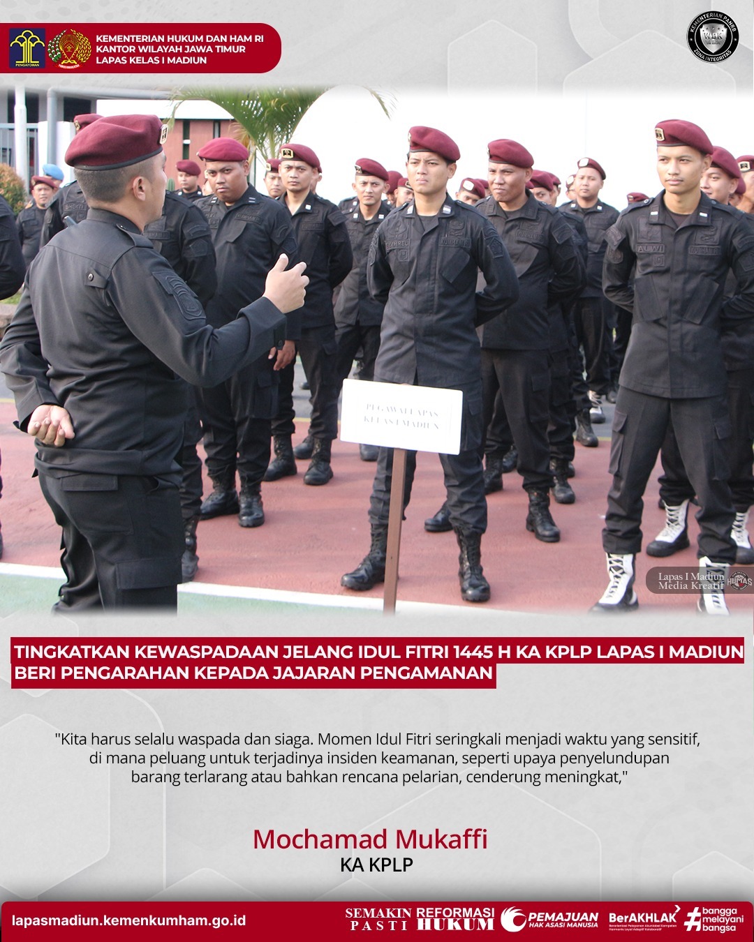 Madiun, Transpos.id – Menjelang perayaan Idul Fitri 1445 H, Kepala Pengamanan Lembaga Pemasyarakatan (KA KPLP) Lapas I Madiun Kanwil Kemenkumham Jatim mengambil langkah proaktif dengan memberikan pengarahan intensif kepada seluruh jajaran pengamanan. Kegiatan ini diadakan di Lapangan Lapas I Madiun, mengemukakan pentingnya peningkatan kewaspadaan dan keamanan dalam rangka menyambut hari raya Idul Fitri.