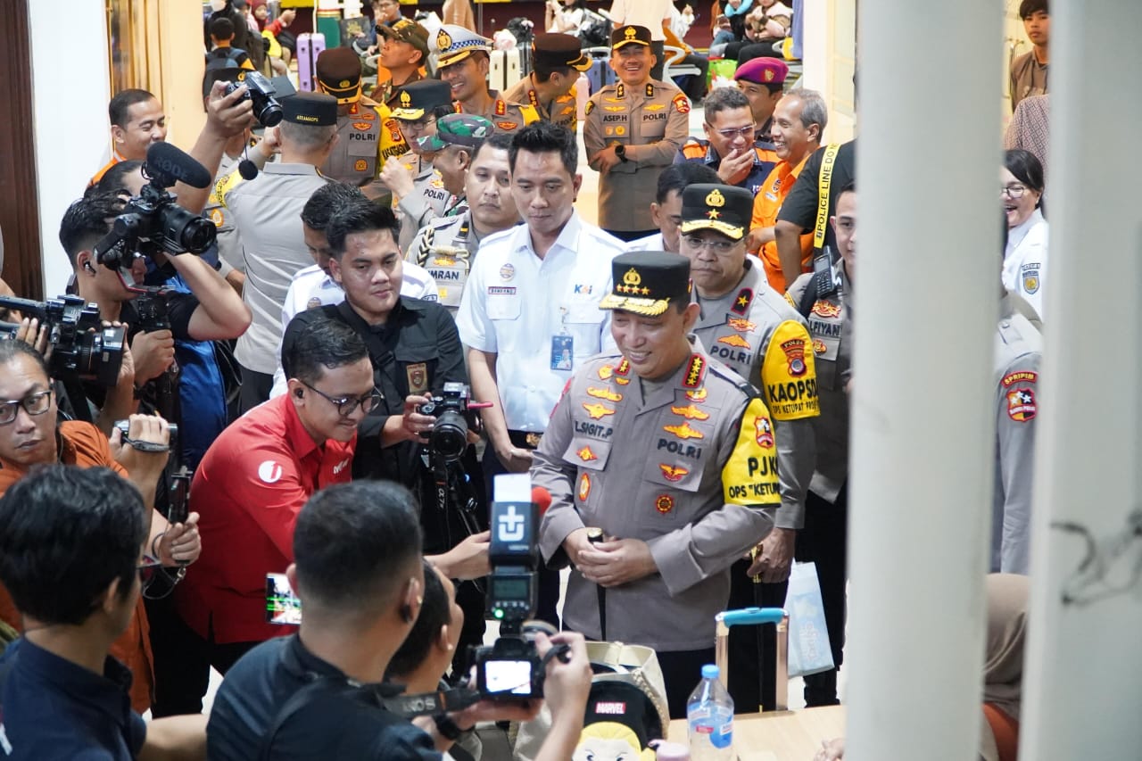 Yogyakarta – Kapolri Jenderal Listyo Sigit Prabowo meninjau Stasiun Tugu Yogyakarta dalam rangka pengamanan mudik Lebaran 2025, Jumat (28/4/2025). Berdasarkan pantauan, terjadi peningkatan arus lalu lintas kereta api dibanding hari biasanya.