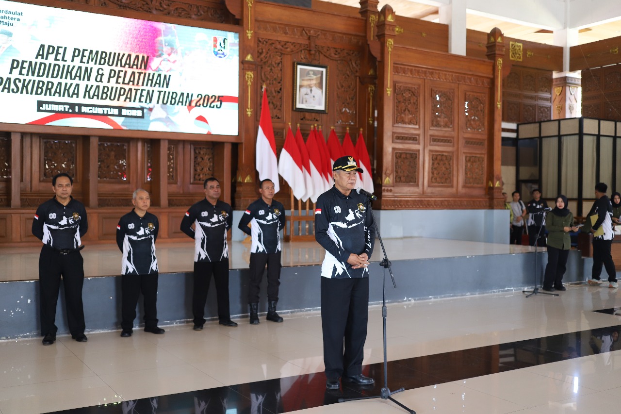 Tuban – Wakil Bupati Tuban, Drs. Joko Sarwono membuka Diklat Calon Paskibraka Kabupaten Tuban tahun 2025, Jumat (01/08) di Pendapa Kridha Manunggal. Hadir pada kesempatan ini Sekda Kabupaten Tuban bersama perwakilan Forkopimda Kabupaten Tuban. Sebanyak 76 calon Paskibraka menunjukkan kemampuan baris berbarisnya.