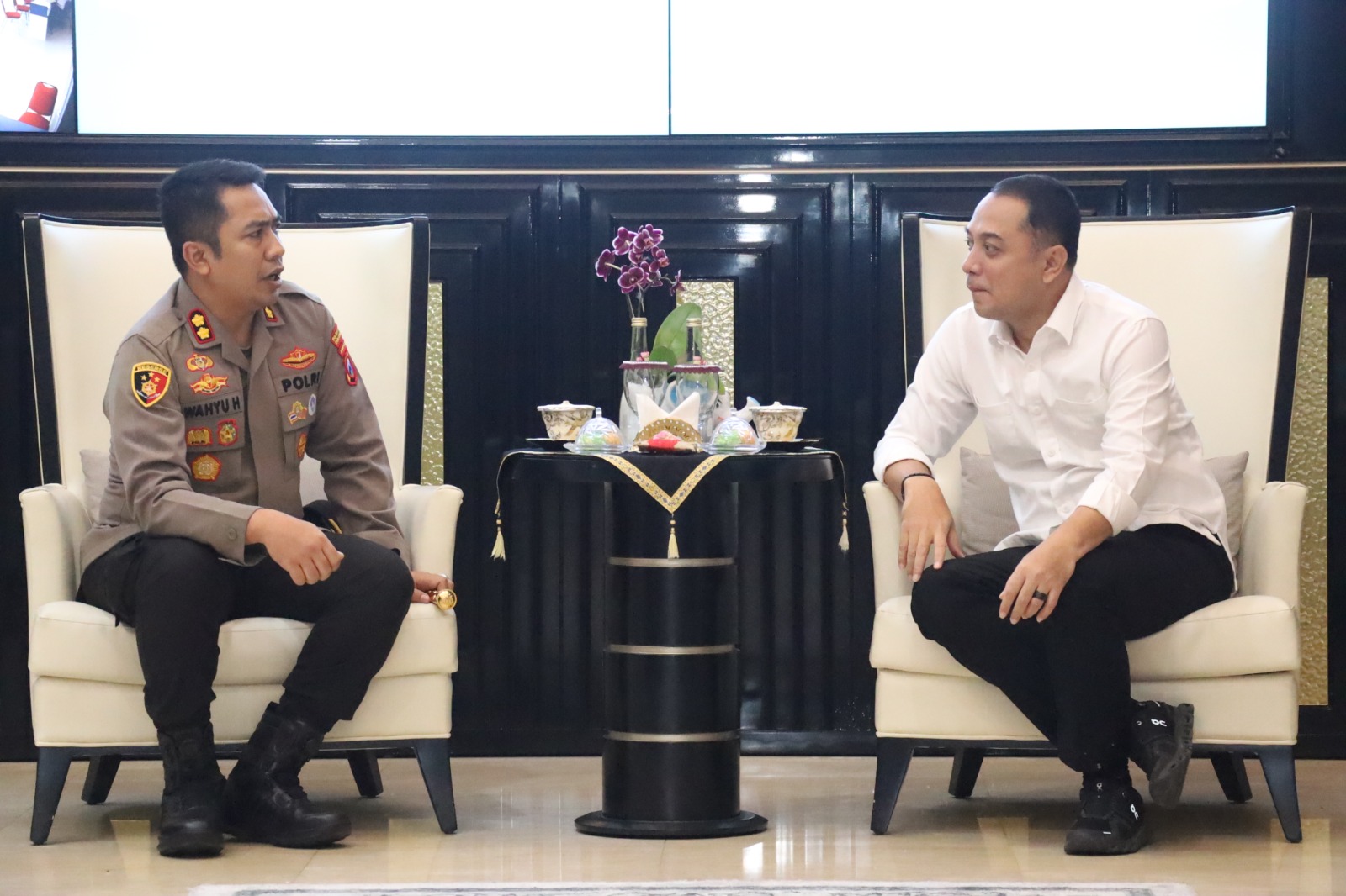 Surabaya – Walikota Surabaya, Eri Cahyadi, menerima kunjungan kerja dari Kapolres Pelabuhan Tanjung Perak, AKBP Wahyu Hidayat, beserta jajaran Pejabat Utama (PJU) di ruang kerjanya, Gedung Balaikota Surabaya, pada Rabu (9/7/2025).