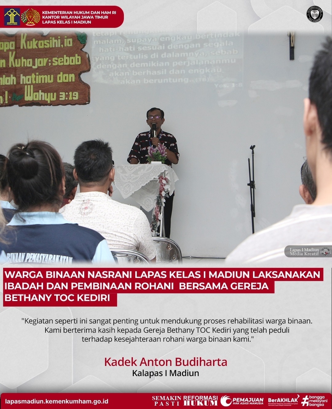 Madiun, Transpos.id- Gereja Bethany TOC Kediri menggelar kegiatan ibadah dan pembinaan rohani yang penuh berkat bagi warga binaan agama Nasrani di Lembaga Pemasyarakatan Kelas I Madiun Kanwil Kemenkumham Jatim. Kegiatan yang dilaksanakan dengan penuh kehangatan dan semangat ini bertujuan untuk memberikan dukungan spiritual kepada para warga binaan, membantu mereka membangun kembali hubungan dengan Tuhan, serta memberikan pembinaan rohani guna mempersiapkan mereka untuk kembali ke masyarakat. Senin (26/02).
