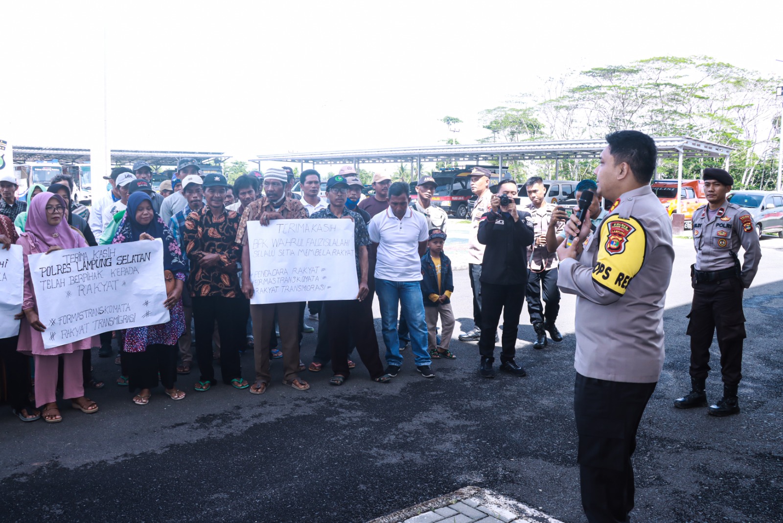 Kapolres Lampung Selatan AKBP Yusriandi Yusrin menyambut baik kehadiran warganya dari Desa Karangsari tersebut, ia didampingi Kasat Reskrim dan Kasat Intelkam Polres Lampung Selatan menerima masyarakat di halaman Polres Lampung Selatan.