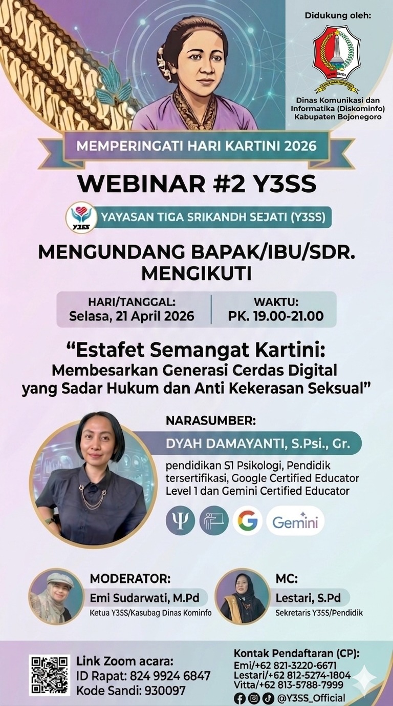 Bojonegoro – Dalam rangka memperingati Hari Kartini 2026, Yayasan Tiga Srikandhi Sejati (Y3SS) kembali menunjukkan komitmennya dalam pemberdayaan perempuan dan generasi muda melalui kegiatan edukatif. Bekerja sama dengan Dinas Komunikasi dan Informatika (Diskominfo) Kabupaten Bojonegoro, Y3SS menggelar Webinar #2 bertajuk “Estafet Semangat Kartini: Membesarkan Generasi Cerdas Digital yang Sadar Hukum dan Anti Kekerasan Seksual”.